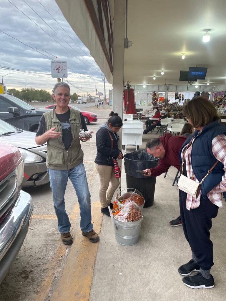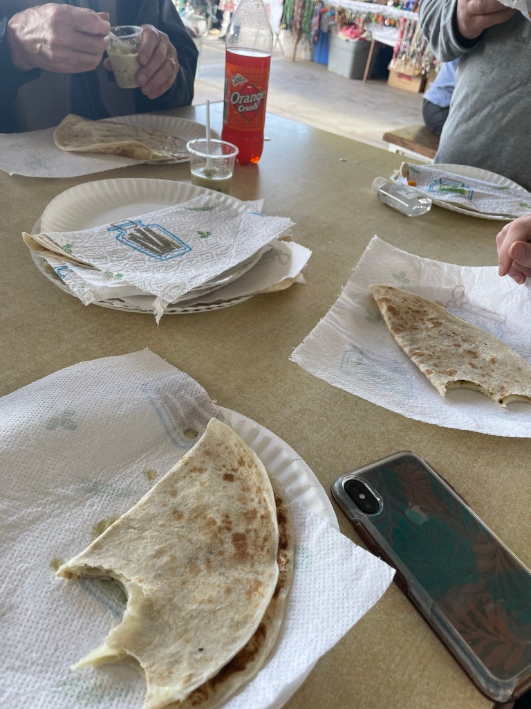 We have a tradition on these trips to stop at our favorite quesadilla stand about an hour from the border. We ordered a stack of fresh asadero cheese quesadillas and a plate full of chapulines (grasshoppers).