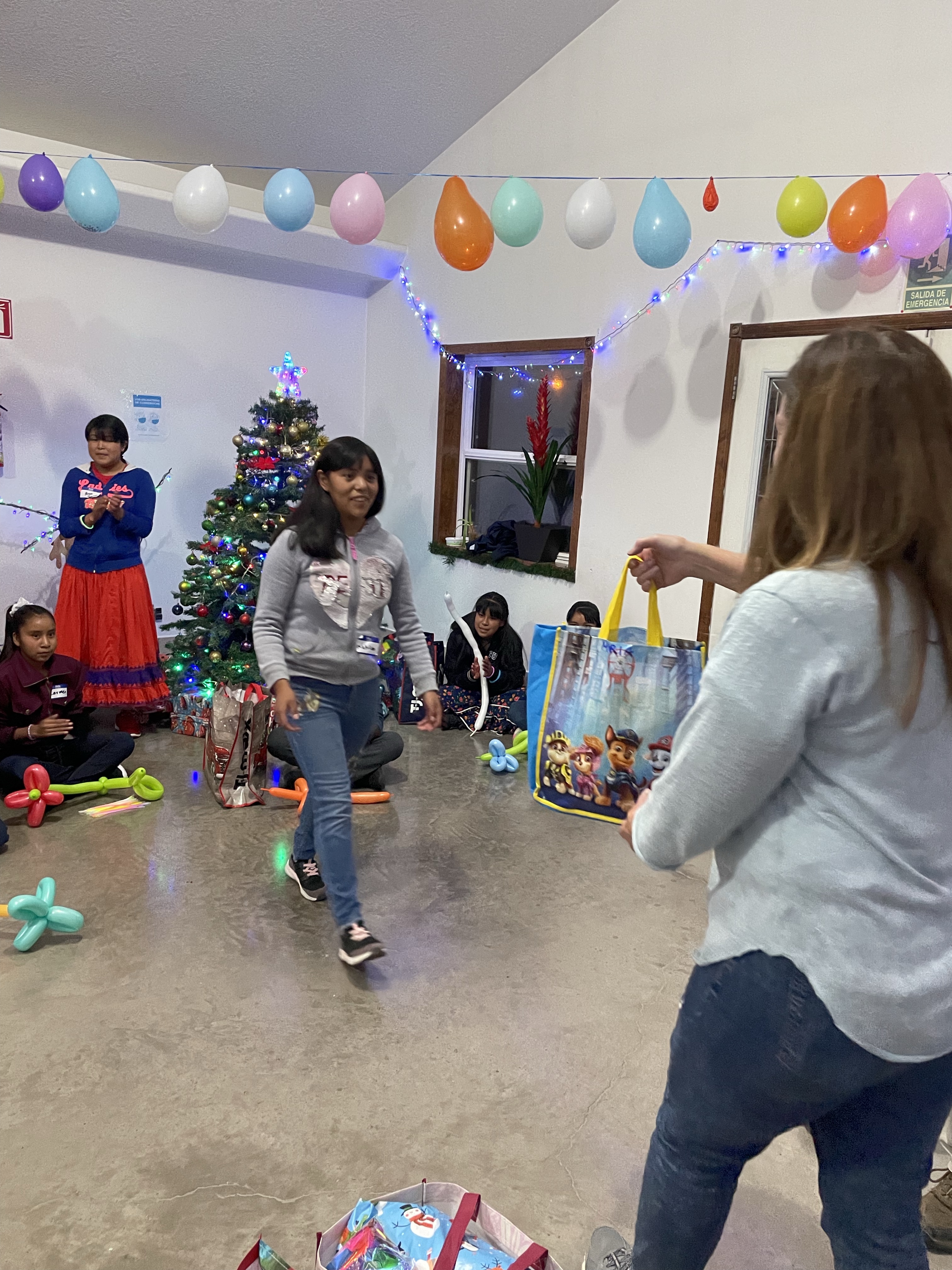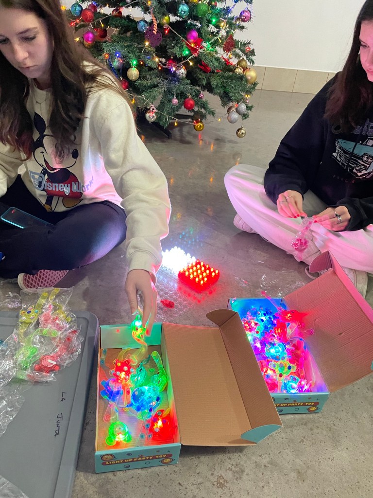 We ate a quick dinner with all the kids consisting of pizza, spaghetti and lots of soda before starting to get all the presents ready. While we carefully checked to make sure each kid had their present, the other half of the group entertained the kids with bubbles, balloon animals, glow sticks and candy.