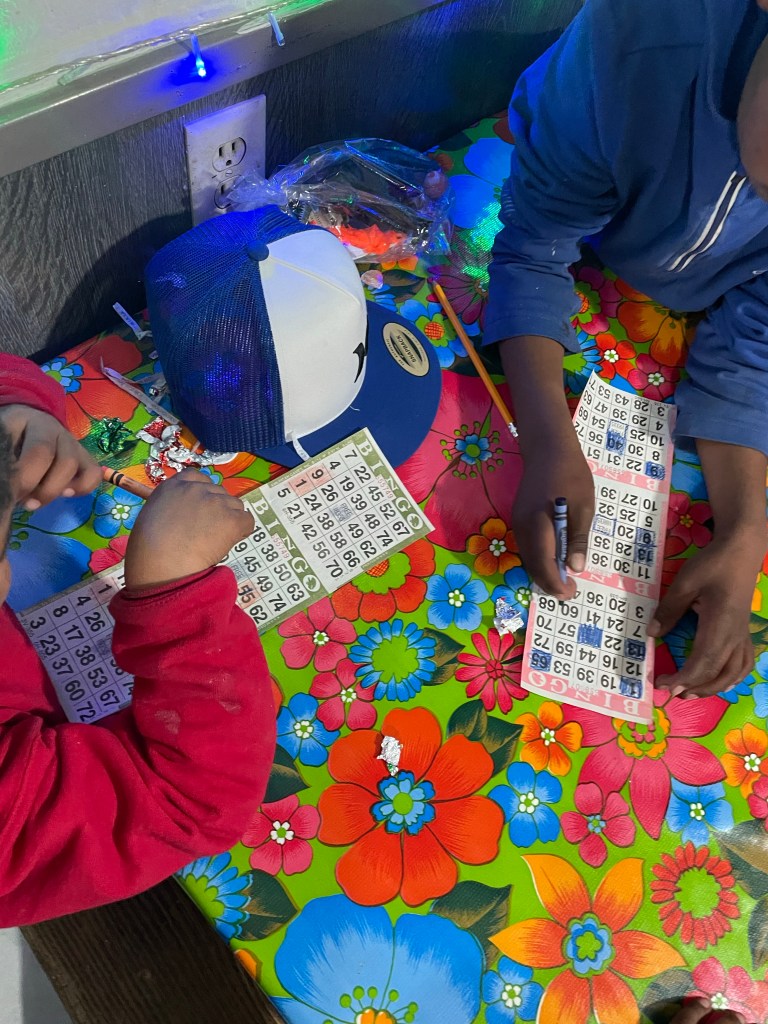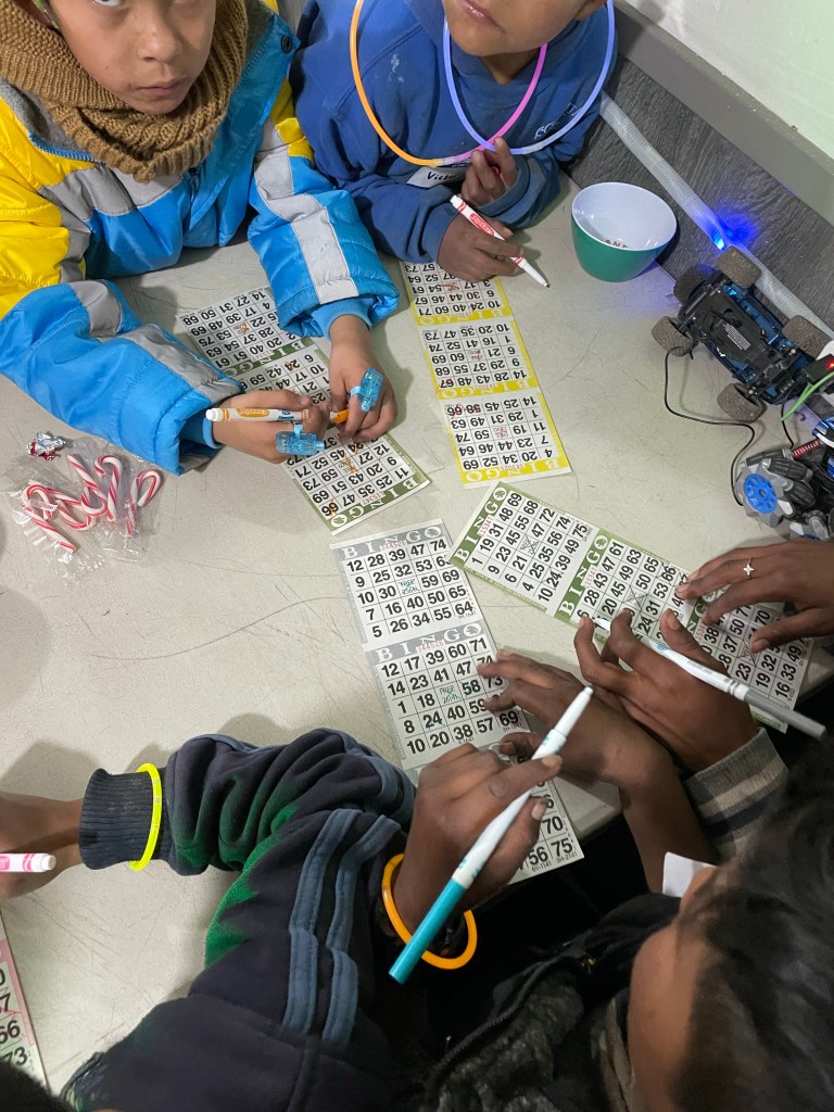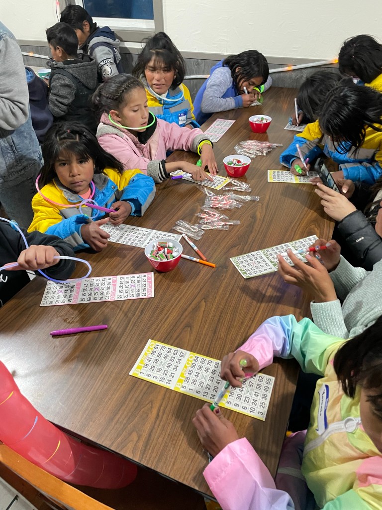 We then headed back to the hotel to freshen up before our big night of activities that we had planned for the kids. Our first thing on the agenda was our legendary yearly bingo game. We started this tradition years ago during one of the first trips. It has consistently been voted the kids’ favorite part of us visiting, even more than our Christmas night. Thanks to many generous donations, we were able to have lots of fun prizes for the kids to choose from.
