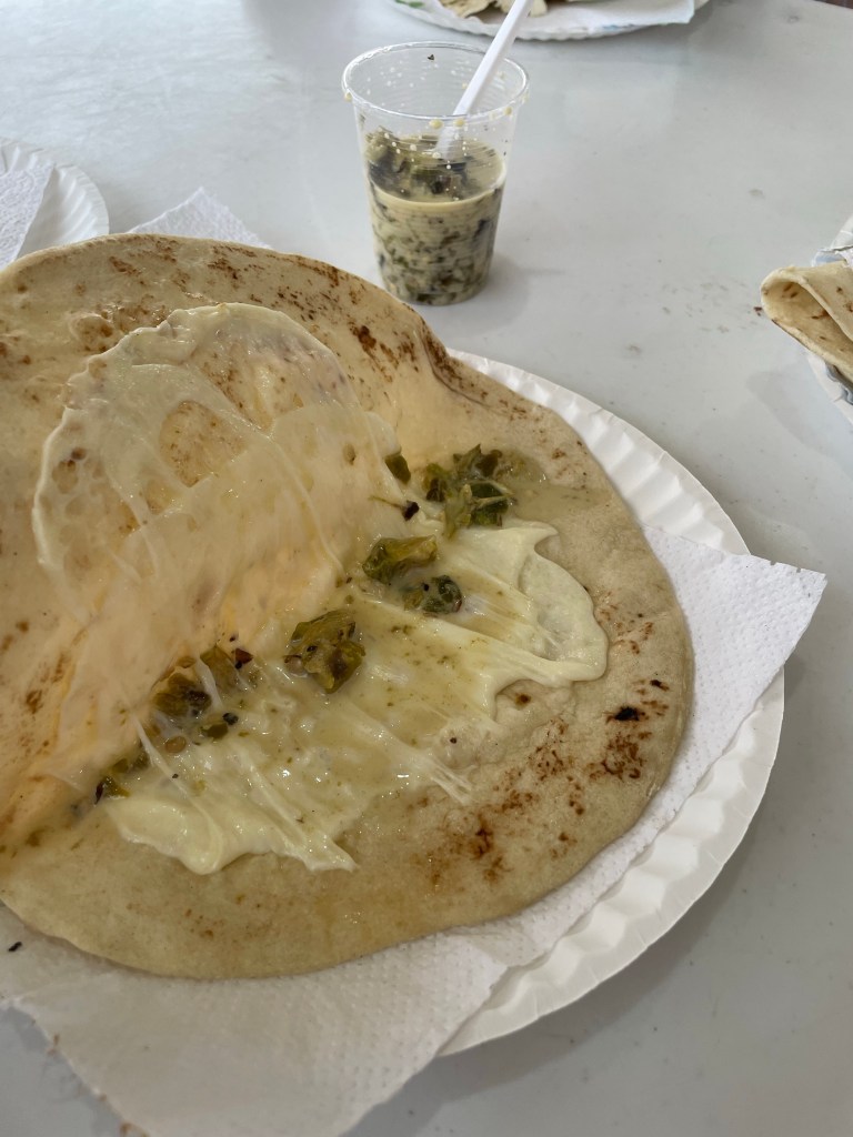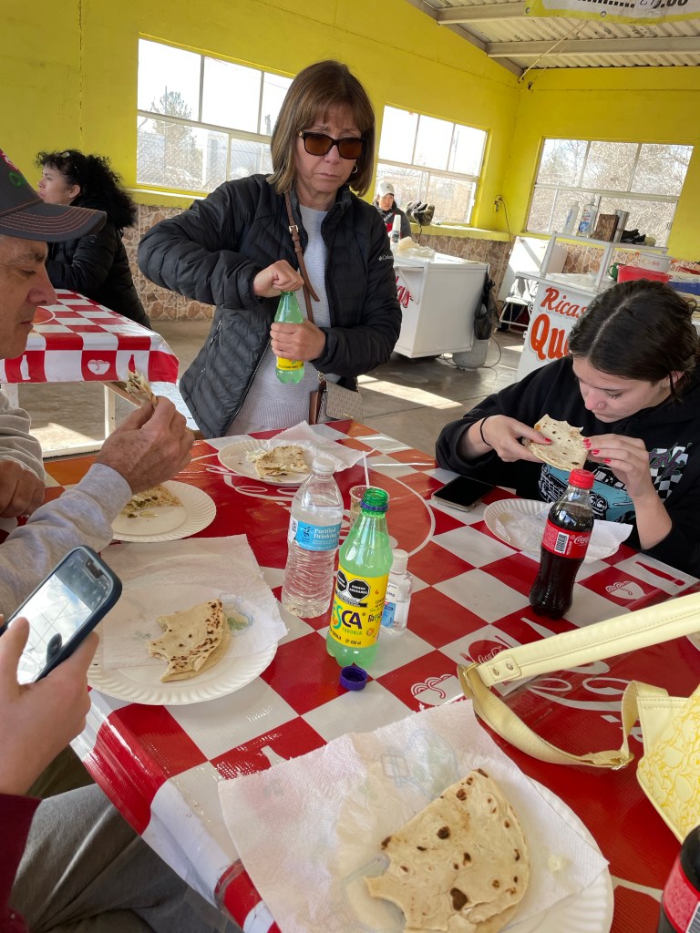 Our traditional first stop is always the food stands in Villa Ahumada, Chihuahua where we get the best asidero cheese quesadillas with roasted jalapeño sauce to put inside.