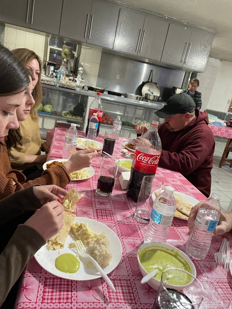 Once we got to the Creel orphanage we greeted everyone before detaching our trailer and parking it in the courtyard. We had to go quickly check in to our nearby hotel and freshen up before dinner. Once we returned to the orphanage we had an awesome dinner waiting for us (plus tres leches cake for dessert.) So we sat down with all the kids and ate.